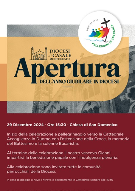 La solenne apertura del Giubileo nelle Diocesi, come stabilito da papa Francesco, avverrà domenica 29 dicembre. A Casale, alle 15,30 il Vescovo reciterà la preghiera per il Giubileo nella chiesa di San Domenico, poi con canonici, parroci e sacerdoti della città e della Diocesi, diaconi, seminaristi e fedeli si formerà la processione per raggiungere la Cattedrale. Qui mons. Sacchi presiederà la celebrazione della Messa, alla quale tutti sono invitati e al termine della quale impartirà la benedizione papale con l’indulgenza plenaria.