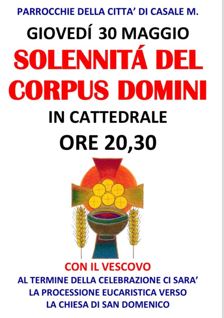 Giovedì 30 maggio, alle 20,30, in Cattedrale a Casale, celebrazione della solennità del Corpus Domini presieduta dal vescovo mons. Gianni Sacchi con le parrocchie della città. Al termine vi sarà la processione eucaristica dalla Cattedrale alla chiesa di San Domenico. Alla Messa è invitata l’intera comunità dei fedeli casalesi.