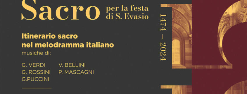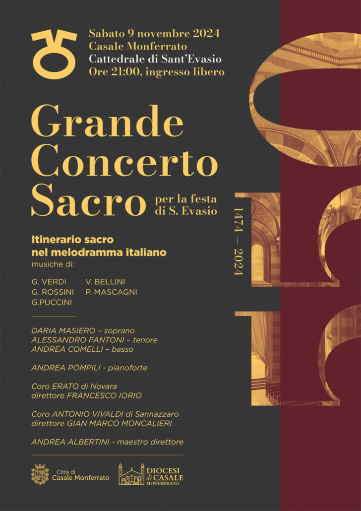 Con la festa del patrono della città e della Diocesi di Casale, torna il tradizionale “Grande concerto per Sant’Evasio”. L’appuntamento, diretto dal maestro Andrea Albertini, è sabato 9 novembre alle 21 in Cattedrale, con ingresso libero. Il programma proposto è un “Itinerario sacro nel melodramma italiano”, con musiche di Verdi, Rossini, Puccini, Bellini e Mascagni.