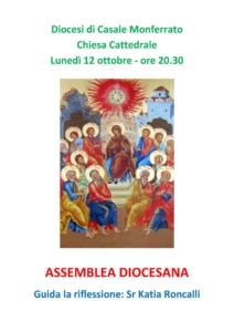 Lunedì 12 ottobre, alle ore 20.30, in Chiesa Cattedrale, si svolgerà la prima serata dell’Assemblea Diocesana, guidata da suor Katia Roncalli. Si tratta di un momento importante per la vita ecclesiale della nostra diocesi di Casale Monferrato. Il nostro Vescovo, Mons. Gianni Sacchi, invita alla partecipazione. Di seguito le parole del Vescovo Gianni