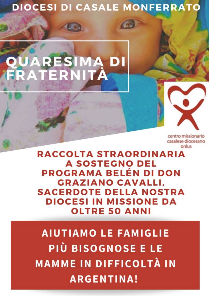 Il Centro Missionario Diocesano propone a tutte le comunità cristiane della diocesi e a tutti coloro che vogliono unirsi in questa “avventura solidale” la “QUARESIMA DI FRATERNITÀ”, a sostegno del lavoro che don Graziano Cavalli, sacerdote della nostra diocesi fidei donum in Argentina dal 1968, svolge nella città di Neuquèn a sostegno delle mamme in difficoltà.