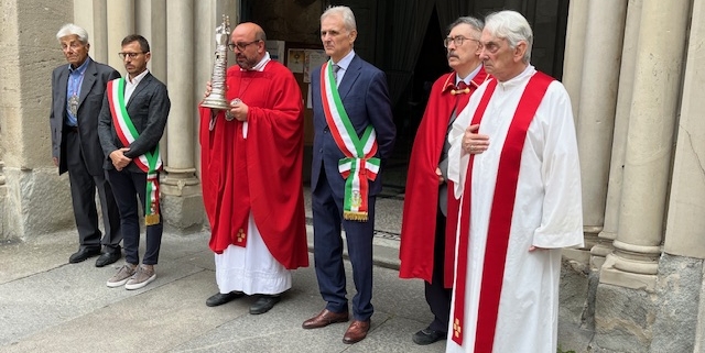 CASALE – La benedizione con la reliquia di Sant’Evasio alle terre del Casalese e del Vercellese dal sagrato della Cattedrale ha suggellato la solenne celebrazione in onore del Patrono da parte della folta delegazione di abitanti di Borgo Vercelli. I borghini hanno sciolto lunedì per la 623° volta il voto fatto a Evasio di recarsi annualmente in pellegrinaggio a Casale se avesse salvato il paese dal pericolo della peste.  Un voto rinnovato più volte nei secoli, ogni cento anni. E il sindaco Mario Demagistri ha già preannunciato che certamente questo avverrà da parte del Comune davanti al notaio anche alla scadenza del 2030.