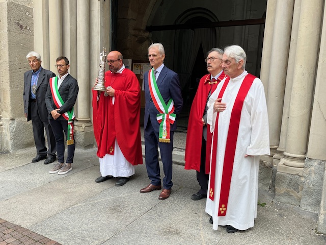CASALE – La benedizione con la reliquia di Sant’Evasio alle terre del Casalese e del Vercellese dal sagrato della Cattedrale ha suggellato la solenne celebrazione in onore del Patrono da parte della folta delegazione di abitanti di Borgo Vercelli. I borghini hanno sciolto lunedì per la 623° volta il voto fatto a Evasio di recarsi annualmente in pellegrinaggio a Casale se avesse salvato il paese dal pericolo della peste.  Un voto rinnovato più volte nei secoli, ogni cento anni. E il sindaco Mario Demagistri ha già preannunciato che certamente questo avverrà da parte del Comune davanti al notaio anche alla scadenza del 2030.