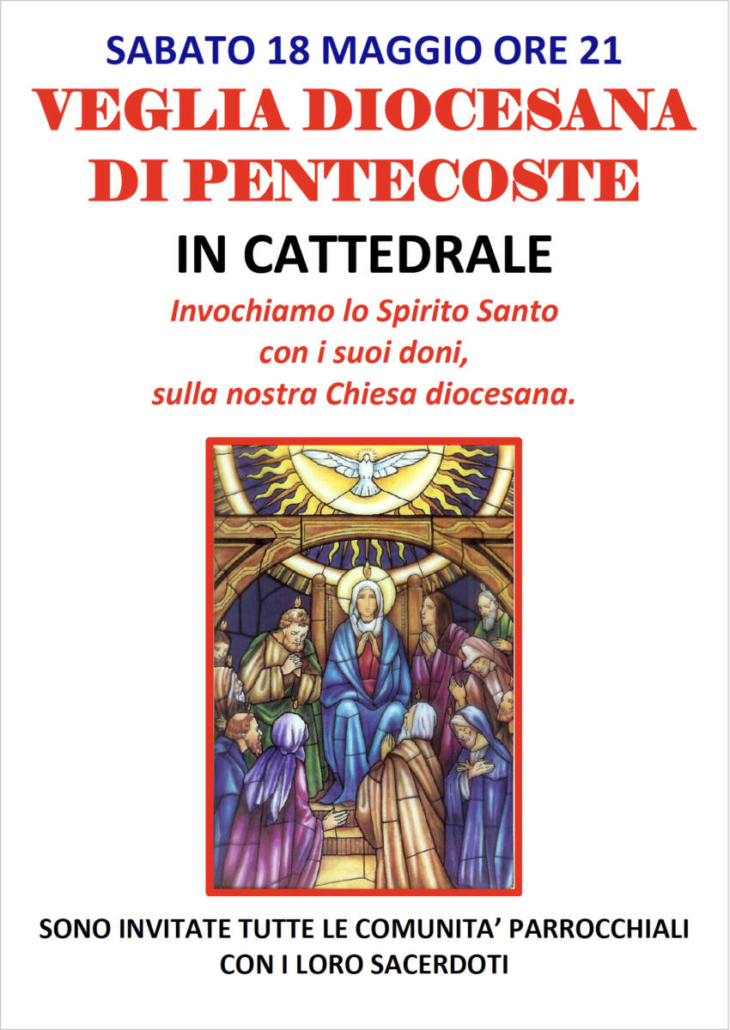 Sarà celebrata sabato 18 maggio, alle 21 in Cattedrale, la Veglia diocesana do Pentecoste presieduta dal vescovo mons. Gianni Sacchi. Alla celebrazione sono invitate tutte le comunità parrocchiali con i loro sacerdoti. Dice il Vescovo: “Invochiamo lo Spirito Santo con i suoi doni sulla nostra Chiesa diocesana”.