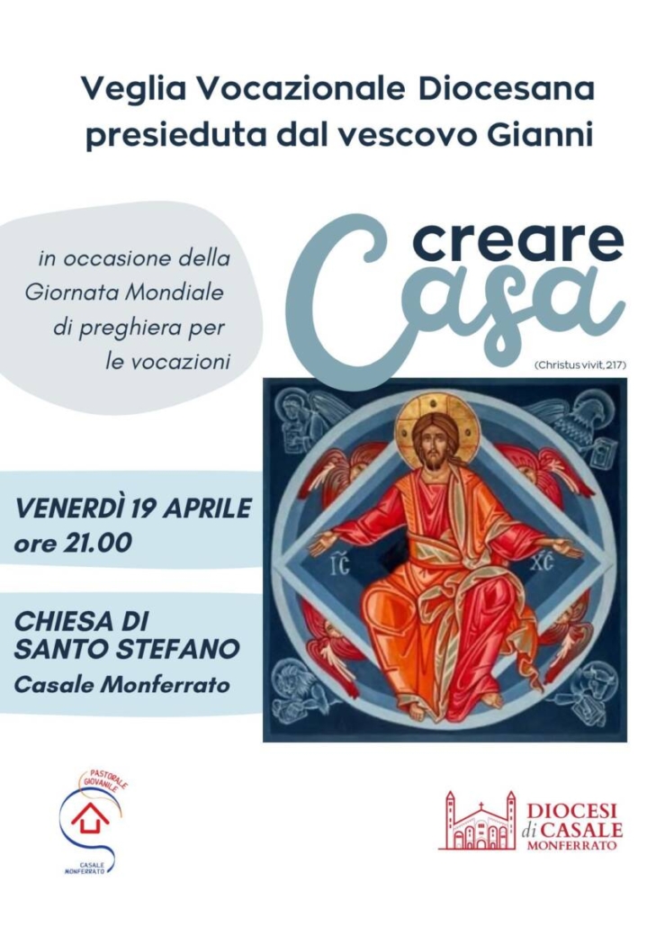 “Creare casa”. E’ questo lo slogan (tratto dall’esortazione apostolica Christus vivit, al n. 217) della 61° Giornata mondiale di preghiera per le vocazioni che si celebra domenica 21 aprile, nella IV domenica di Pasqua (detta del Buon Pastore). In vista della Giornata, venerdì 19 aprile il vescovo mons. Gianni Sacchi presiederà alle 21 nella chiesa di Santo Stefano, a Casale, una Veglia vocazionale diocesana. L’iniziativa è promossa dalla Pastorale giovanile, di cui è responsabile don Gabriele Paganini.